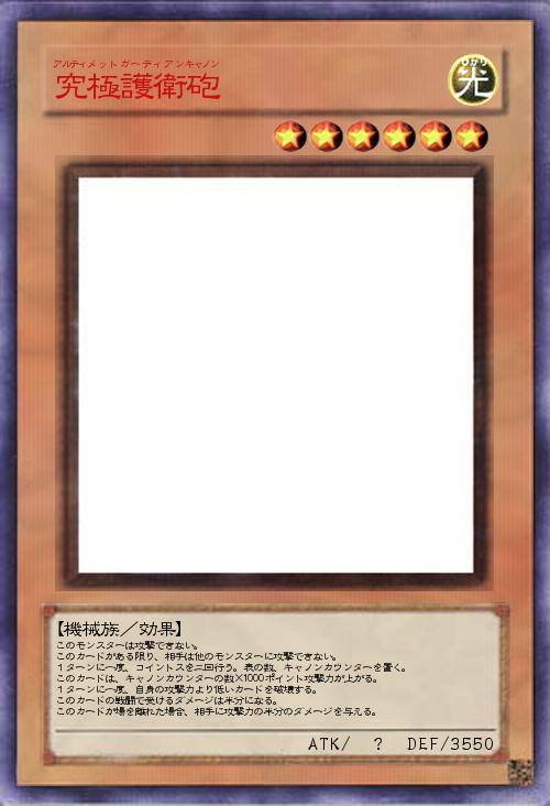 | このモンスターは攻撃できない。 このカードがある限り、相手は他のモンスターに攻撃できない。 1ターンに一度、コイントスを二回行う。表の数、キャノンカウンターを置く。 このカードは、キャノンカウンターの数×1000ポイント攻撃力が上がる。 1ターンに一度、自身の攻撃力より低いカードを破壊する。 このカードの戦闘で受けるダメージは半分になる。 このカードが場を離れた場合、相手に攻撃力の半分のダメージを与える。 | |||