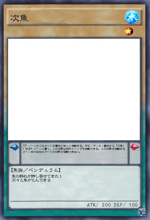 | ①Pゾーンのこのカードを墓地に送って発動する。手札・デッキ・墓地から「次魚」1体をPゾーンに置く。この効果は相手ターンでも発動できる。この効果を発動するターン自分は他のカードの効果を発動できない。 | |||