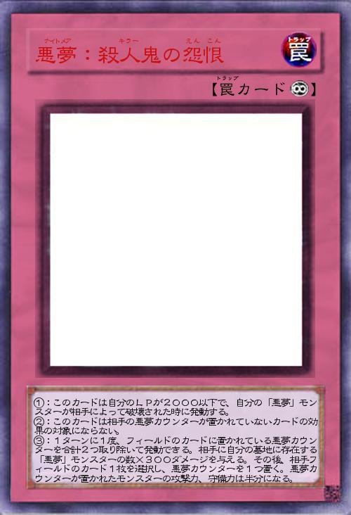 その恨みで脱出しようとする相手をじわじわと悪夢に引きずり込む最後のあがき。デュエル終盤では墓地にキラーが溜まっているのでダメージも大きくなる。ただし悪夢カウンターを与える効果もあるので選ぶカードは慎重に。悪夢の世界環境下ではノーコストで放てるが、サイクロンなどで破壊される恐れが高い。呪い強化と共に運用しよう。」(2018-11-06 06:28)