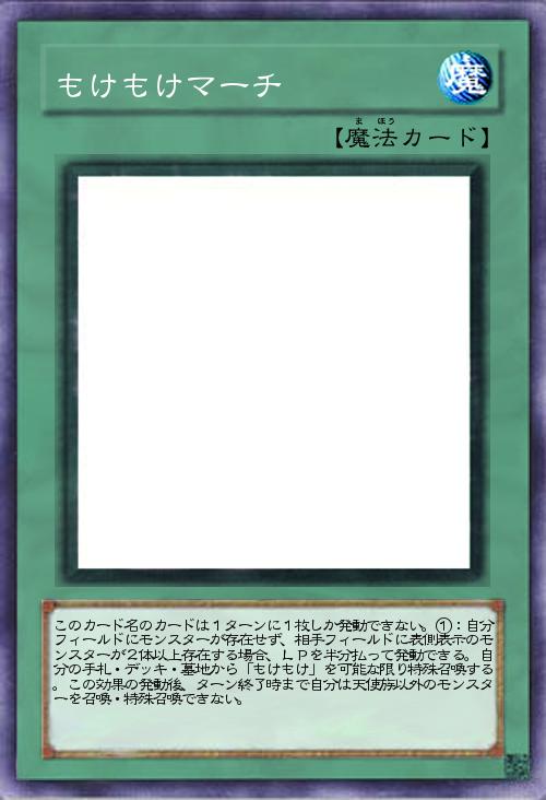 | このカード名のカードは1ターンに1枚しか発動できない。①:自分フィールドにモンスターが存在せず、相手フィールドに表側表示のモンスターが2体以上存在する場合、LPを半分払って発動できる。自分の手札・デッキ・墓地から「もけもけ」を可能な限り特殊召喚する。この効果の発動後、ターン終了時まで自分は天使族以外のモンスターを召喚・特殊召喚できない。 | |||