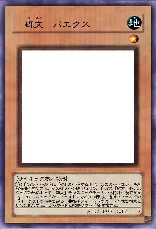 | ①:自分フィールドに「碑」が存在する場合、このカードはデッキから特殊召喚できる。その後ターン終了時まで、自分は「碑文」モンスターの効果によって「碑文」モンスターをデッキから特殊召喚できない。②:このカードがフィールドに存在する限り、自分フィールドの「碑」は以下の効果を得る。●相手フィールドのカード1枚を対象として発動できる。このカードと対象のカードを破壊する。 | |||