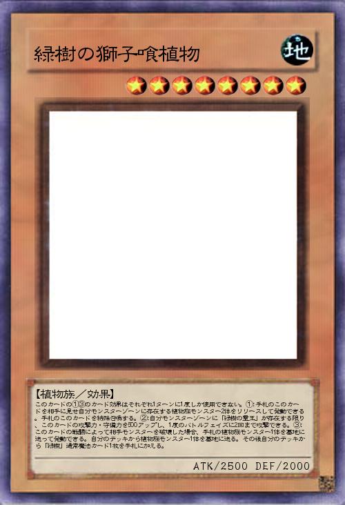 | このカードの①③のカード効果はそれぞれ1ターンに1度しか使用できない。①:手札のこのカードを相手に見せ自分モンスターゾーンに存在する植物族モンスター2体をリリースして発動できる。手札のこのカードを特殊召喚する。②:自分モンスターゾーンに「緑樹の霊王」が存在する限り、このカードの攻撃力・守備力を500アップし、1度のバトルフェイズに2回まで攻撃できる。③:このカードの戦闘によって相手モンスターを破壊した場合、手札の植物族モンスター1体を墓地に送って発動できる。自分のデッキから植物族モンスター1体を墓地に送る。その後自分のデッキから「緑樹」通常魔法カード1枚を手札に加える。 | |||
