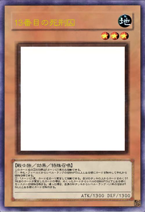 | このカード名の②の効果は1ターンに1度のみ発動できる。 ①:手札・フィールドからレベル・ランクの合計が13以上となる様にカードを除外して手札から特殊召喚できる。 ②:1ターンに1度、カード名を一つ宣言して発動できる。自分のデッキの上からカードをめくり13枚目のカードが宣言したカードの場合、めくったカードからレベルの合計が13以下となる様にモンスターを特殊召喚する。違った場合、自身のEXデッキからレベル・ランク・LINKの合計が13以上となる様にカードを除外する。 | |||