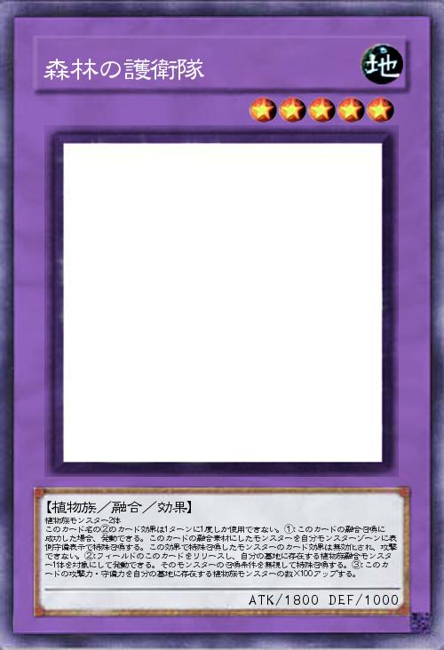 | 植物族モンスター2体 このカード名の②のカード効果は1ターンに1度しか使用できない。①:このカードの融合召喚に成功した場合、発動できる。このカードの融合素材にしたモンスターを自分モンスターゾーンに表側守備表示で特殊召喚する。この効果で特殊召喚したモンスターのカード効果は無効化され、攻撃できない。②:フィールドのこのカードをリリースし、自分の墓地に存在する植物族融合モンスター1体を対象にして発動できる。そのモンスターの召喚条件を無視して特殊召喚する。③:このカードの攻撃力・守備力を自分の墓地に存在する植物族モンスターの数×100アップする。 | |||