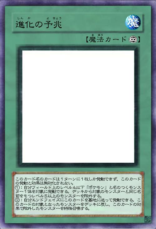 | このカード名のカードは1ターンに1枚しか発動できず、このカードの発動と効果は無効化されない。 ①:自分フィールド上のレベル4以下「ポケモン」と名のつくモンスター1体を対象に発動できる。デッキから対象のモンスターと同じ名前をもつレベル5以上のモンスターを除外する。 ②:自分エンドフェイズにこのカードを墓地に送って発動できる。このカードの対象となったモンスターをデッキに戻し、このカードの効果で除外したモンスターを特殊召喚する。 | |||
