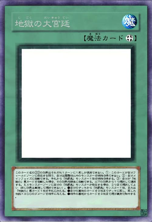 | このカード名の②③の効果はそれぞれ1ターンに1度しか使用できない。①:このカードが自分フィールドゾーンに存在する限り、自分は闇属性以外のモンスターを特殊召喚できない。②:自分メインフェイズに発動できる。手札から「処罰鬼」モンスター1体を特殊召喚する。③:自分が「地獄の」罠カードを発動した場合、その効果処理後に発動できる。以下の効果から1つ選択して適用する。EXモンスターゾーンに自分の「処罰鬼」モンスターが存在する場合、2つまで選択してよい(同じ効果は重複して選択できない)。●自分のデッキから「処罰鬼」モンスター1体、または「地獄の」罠カード1枚を手札に加える。●自分の墓地のカードを3枚までデッキに戻し、戻した枚数×300のダメージを相手に与える。●相手の墓地からカードを3枚まで選び裏側で除外する。 | |||