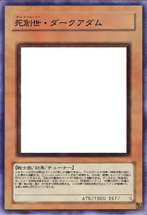 | このカードの②の効果は1ターンに1度しか発動できない。①このカードが召喚・特殊召喚に成功した場合に発動する。フィールド上のトークンを全て破壊する。その後、破壊したトークンの数×300ダメージを与える。②自分の墓地のカードを1枚除外して発動できる。デッキから「死創世」モンスターを特殊召喚するか、お互いのフィールドに「死創世トークン」(攻撃力2000・守備力0・闇・戦士族・星4)を1体ずつ特殊召喚する。この効果で特殊召喚されたトークンが破壊される度に相手に500ダメージ与える。 | |||