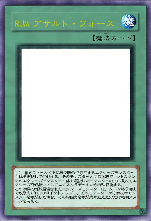 | (1)自分フィールド上に表側表示で存在するエクシーズモンスター1体を選択して発動する。そのモンスターと同じ種族で1つ上のランクのエクシーズモンスター1体を選択したモンスターの上に重ねてエクシーズ召喚扱いとしてエクストラデッキから特殊召喚する。 この効果で特殊召喚されたエクシーズモンスターは、ターン終了時まで攻撃力が1000ポイントアップし、そのモンスターが守備表示モンスターを攻撃した場合、その守備力を攻撃力が超えた分だけ戦闘ダメージを与える。 | |||