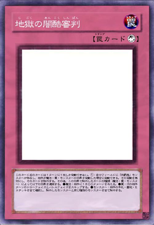 | このカード名のカードは1ターンに1枚しか発動できない。①:自分フィールドに「処罰鬼」モンスターが存在し、相手が魔法・罠・モンスターの効果を発動した場合に発動できる。その発動を無効にし、そのカードを除外する。その後、この効果で除外したカードの種類(魔法・罠・モンスター)によって以下の効果を適用する。●魔法:相手に1500ダメージを与える。●罠:次の相手ターンのドローフェイズとバトルフェイズをスキップする。●モンスター:相手の手札・墓地・EXデッキを全て確認し、除外したモンスターと同じ種族のモンスターを全て除外する。 | |||