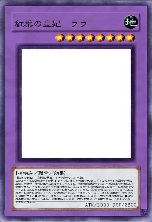 | 「紅葉の女王」+「緑樹の霊王」+植物族モンスター2体 このカード名の③のカード効果は1ターンに1度しか使用できない。①:このカードの融合召喚に成功した場合、自分の墓地に存在するレベル5以下の植物族通常モンスターを2体まで対象にして発動できる。そのモンスターを特殊召喚する。②:このカードの攻撃力はこのカード以外の自分フィールドに存在する植物族モンスターの数×200アップする。③:自分のスタンバイフェイズにこのカード以外の自分フィールドの植物族モンスター1体をリリースし、以下の効果から1つを選んで発動できる。●自分のデッキからレベル4以下の植物族モンスター1体を特殊召喚する。●自分の墓地に存在するレベル3以下の植物族モンスター1体を対象にして発動できる。そのモンスターを手札に加える。 | |||