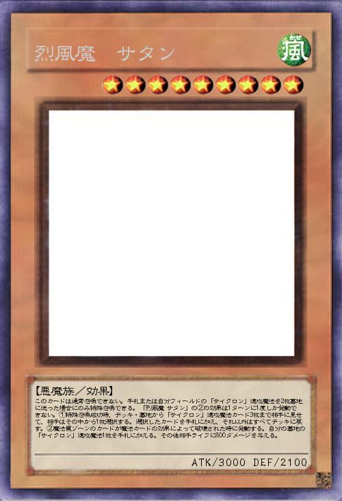 | このカードは通常召喚できない。手札または自分フィールドの「サイクロン」速攻魔法を2枚墓地に送った場合にのみ特殊召喚できる。「烈風魔 サタン」の②の効果は1ターンに1度しか発動できない。①特殊召喚成功時、デッキ・墓地から「サイクロン」速攻魔法カード3枚まで相手に見せて、相手はその中から1枚選択する。選択したカードを手札に加え、それ以外はすべてデッキに戻す。②魔法罠ゾーンのカードが魔法カードの効果によって破壊された時に発動する。自分の墓地の「サイクロン」速攻魔法1枚を手札に加える。その後相手ライフに800ダメージを与える。 | |||