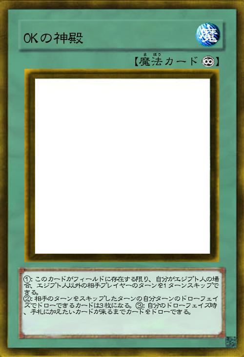 | ①:このカードがフィールドに存在する限り、自分がエジプト人の場合、エジプト人以外の相手プレイヤーのターンを1ターンスキップできる。 ②:相手のターンをスキップしたターンの自分ターンのドローフェイズでドローできるカードは3枚になる。③:自分のドローフェイズ時、手札に加えたいカードが来るまでカードをドローできる。 | |||