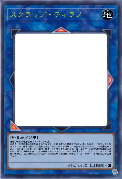 | 種族が異なる地属性モンスター2体以上 このカード名の①②の効果はそれぞれ1ターンに1度しか使用できない。①:このカードのリンク先のモンスター1体を対象にして発動できる。そのカードを破壊し、デッキからレベル4以下の地属性モンスターまたは「スクラップ」魔法・罠カード1枚を手札に加える。②:このカードが破壊され墓地に送られた場合に発動できる。自分の墓地からリンクモンスター以外の「スクラップ」モンスター1体を特殊召喚する。この効果でSモンスターを特殊召喚した場合、相手フィールドのカード1枚を選んで破壊できる。 | |||