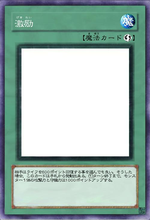 | 相手はライフを600ポイント回復する事を選んでも良い。そうした場合、このカードは手札から発動出来る。①ターン終了まで、モンスター1体の攻撃力と守備力は1000ポイントアップする。 | |||