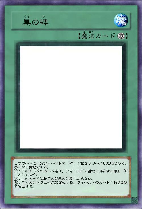 | このカードは自分フィールドの「碑」1枚をリリースした場合のみ、手札から発動できる。 ①:このカードのカード名は、フィールド・墓地に存在する限り「碑」として扱う。 ②:このカードは相手の効果の対象にならない。 ③:自分エンドフェイズに発動する。フィールドのカード1枚を選んで破壊する。 | |||