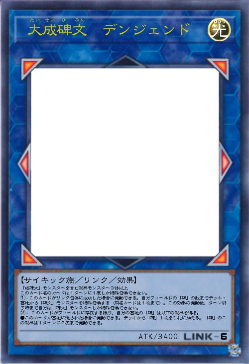 | 「成碑文」モンスターを含む効果モンスター3体以上 このカード名のカードは1ターンに1度しか特殊召喚できない。 ①:このカードがリンク召喚に成功した場合に発動できる。自分フィールドの「碑」の数までデッキ・墓地から「碑文」モンスターを特殊召喚する(同名カードは1枚まで)。この効果の発動後、ターン終了時まで自分は「碑文」モンスターしか特殊召喚できない。 ②: このカードがフィールドに存在する限り、自分の墓地の「碑」は以下の効果を得る。 ●このカードが墓地に送られた場合に発動できる。デッキから「碑」1枚を手札に加える。「碑」のこの効果は1ターンに3度まで発動できる。 | |||