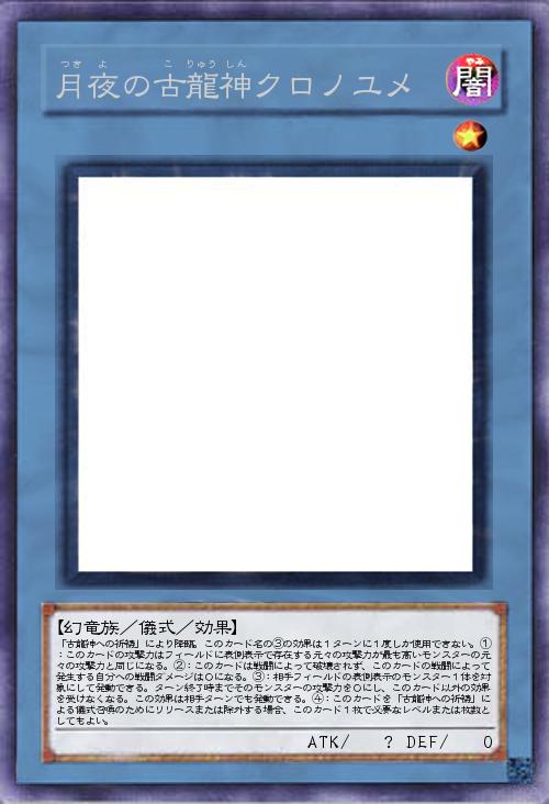 | 「古龍神への祈祷」により降臨。このカード名の③の効果は1ターンに1度しか使用できない。①:このカードの攻撃力はフィールドに表側表示で存在する元々の攻撃力が最も高いモンスターの元々の攻撃力と同じになる。②:このカードは戦闘によって破壊されず、このカードの戦闘によって発生する自分への戦闘ダメージは0になる。③:相手フィールドの表側表示のモンスター1体を対象にして発動できる。ターン終了時までそのモンスターの攻撃力を0にし、このカード以外の効果を受けなくなる。この効果は相手ターンでも発動できる。④:このカードを「古龍神への祈祷」による儀式召喚のためにリリースまたは除外する場合、このカード1枚で必要なレベルまたは枚数としてもよい。 | |||