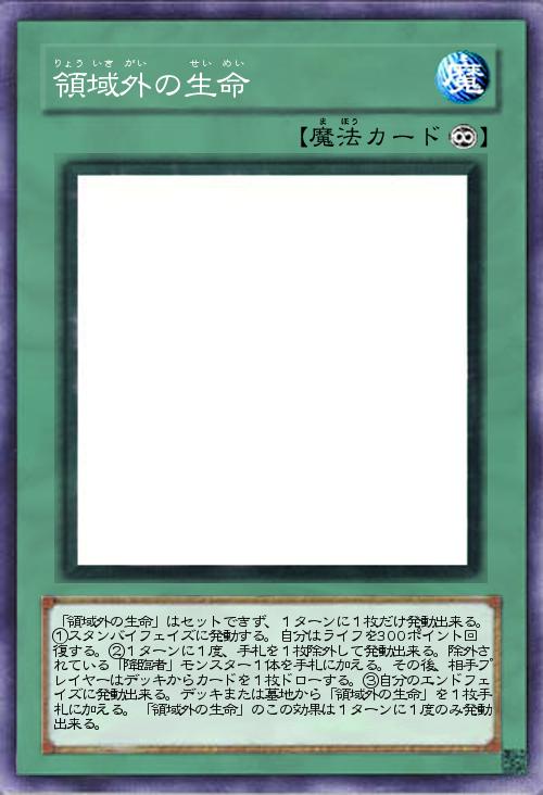 | 「領域外の生命」はセットできず、1ターンに1枚だけ発動出来る。①スタンバイフェイズに発動する。自分はライフを300ポイント回復する。②1ターンに1度、手札を1枚除外して発動出来る。除外されている「降臨者」モンスター1体を手札に加える。その後、相手プレイヤーはデッキからカードを1枚ドローする。③自分のエンドフェイズに発動出来る。デッキまたは墓地から「領域外の生命」を1枚手札に加える。「領域外の生命」のこの効果は1ターンに1度のみ発動出来る。 | |||
