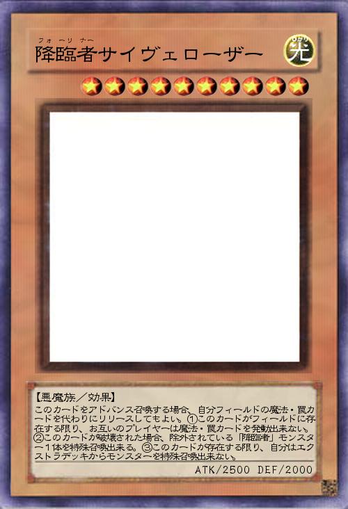 | このカードをアドバンス召喚する場合、自分フィールドの魔法・罠カードを代わりにリリースしてもよい。①このカードがフィールドに存在する限り、お互いのプレイヤーは魔法・罠カードを発動出来ない。②このカードが破壊された場合、除外されている「降臨者」モンスター1体を特殊召喚出来る。③このカードが存在する限り、自分はエクストラデッキからモンスターを特殊召喚出来ない。 | |||