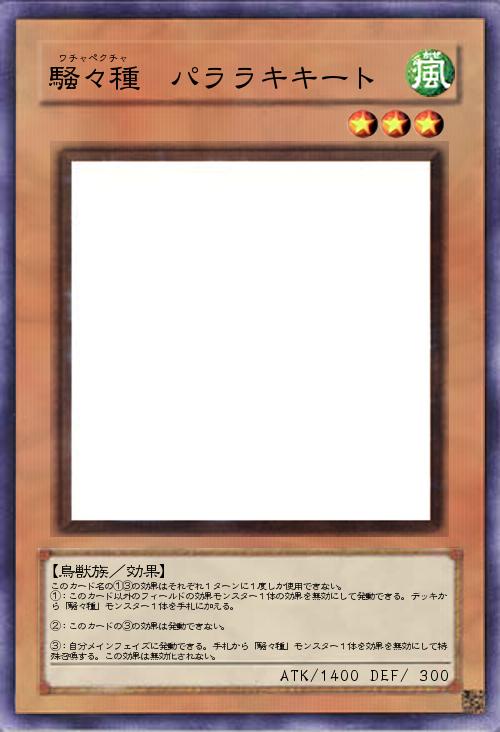 このカードは「パラキート」、インコです。鬱陶しいほどに字を増やしていく命名法です。他のモンスターが必要ですがサーチ効果を持ち、後攻なら相手を沈黙させながら展開札などを持ってくることができます。無効時の効果は手札からの展開。」(2018-11-22 19:48)