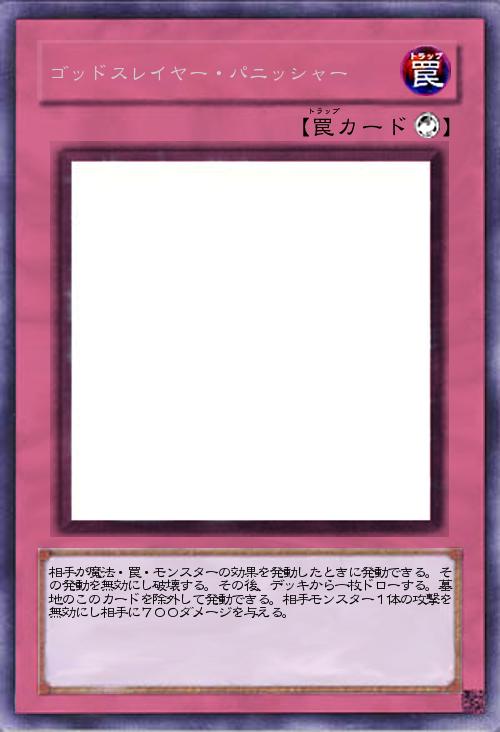 | 相手が魔法・罠・モンスターの効果を発動したときに発動できる。その発動を無効にし破壊する。その後、デッキから一枚ドローする。墓地のこのカードを除外して発動できる。相手モンスター1体の攻撃を無効にし相手に700ダメージを与える。 | |||