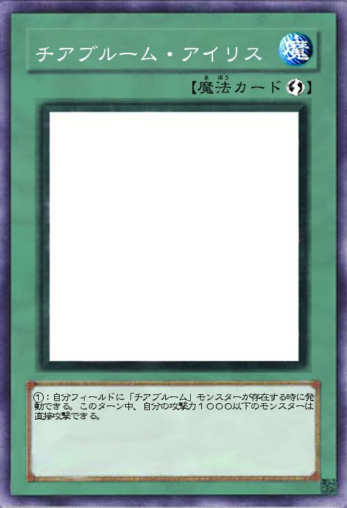 | ①:自分フィールドに「チアブルーム」モンスターが存在する時に発動できる。このターン中、自分の攻撃力1000以下のモンスターは直接攻撃できる。 | |||