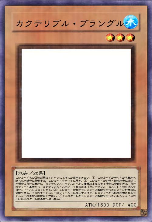 | このカード名の②の効果は1ターンに1度しか使用できない。①:このカードがデッキから墓地へ送られた場合に発動する。このカードをデッキに戻す。②:このカードが召喚・特殊召喚に成功した場合に自分の墓地に「カクテリブル」モンスターが3種類以上存在する場合に発動できる。自分のデッキ・墓地から「カクテリブル・ステア」1枚または「カクテリブル・ビルド」1枚を選んで自分フィールドにセットする。③:このカードが相手モンスターと戦闘を行ったダメージ計算後に発動できる。その相手モンスターはフィールドに存在する限り、EXデッキから特殊召喚されるモンスターの素材には使用できない。④:このカードがモンスターと戦闘を行ったバトルフェイズ終了時にこのカードは墓地へ送られる。 | |||