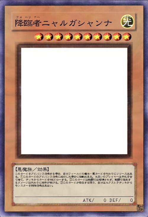 | このカードをアドバンス召喚する場合、自分フィールドの魔法・罠カードを代わりにリリース出来る。①このカードのアドバンス召喚に成功した場合に発動出来る。お互いのプレイヤーは手札を全て捨て、デッキからカードを4枚ドローする。②このカードは戦闘では破壊されず、戦闘で発生するダメージは代わりに相手が受ける。③このカードが存在する限り、自分はエクストラデッキからモンスターを特殊召喚出来ない。 | |||