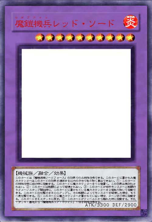 | このカードは「魔鎧装機ソードフォース」の効果でのみ特殊召喚できる。このカードに置かれた魔力カウンターはこのカードの効果を適用する以外の方法で取り除く事はできない。①:このカードの特殊召喚に成功時に発動する。このカードに魔力カウンターを10個置く。この効果は無効化されない。②:このカードは戦闘によって破壊されない。③:このカードが相手モンスターと戦闘行うダメージステップ開始時に、このカードに置かれている魔力カウンターを2個取り除いて発動できる。このカードの攻撃力を500アップし、その戦闘によってモンスターを破壊した場合、もう一度攻撃できる。④:このカードに魔力カウンターが置かれていない場合、ターン終了時に発動する。このカードをEXデッキに戻す。⑤:このカードがフィールドから離れた時に発動する。手札・デッキ・墓地から「魔鎧機兵コア・ホワイト」1体を特殊召喚する。 | |||