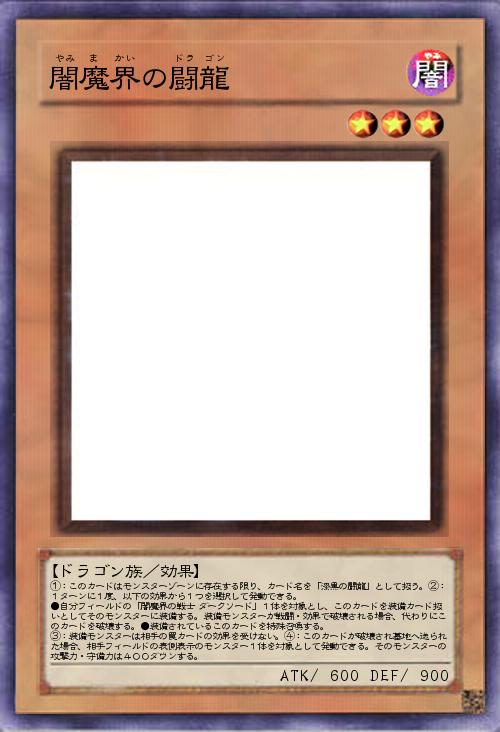 | ①:このカードはモンスターゾーンに存在する限り、カード名を「漆黒の闘龍」として扱う。②:1ターンに1度、以下の効果から1つを選択して発動できる。 ●自分フィールドの「闇魔界の戦士 ダークソード」1体を対象とし、このカードを装備カード扱いとしてそのモンスターに装備する。装備モンスターが戦闘・効果で破壊される場合、代わりにこのカードを破壊する。●装備されているこのカードを特殊召喚する。 ③:装備モンスターは相手の罠カードの効果を受けない。④:このカードが破壊され墓地へ送られた場合、相手フィールドの表側表示のモンスター1体を対象として発動できる。そのモンスターの攻撃力・守備力は400ダウンする。 | |||