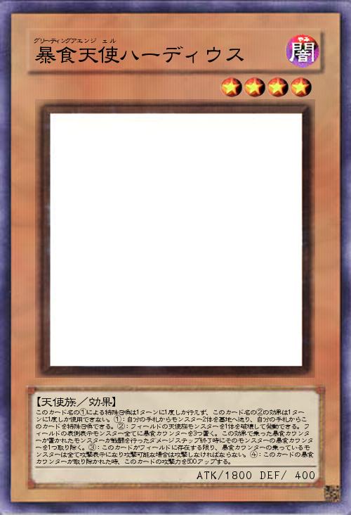 | このカード名の①による特殊召喚は1ターンに1度しか行えず、このカード名の②の効果は1ターンに1度しか使用できない。①:自分の手札からモンスター2体を墓地へ送り、自分の手札からこのカードを特殊召喚できる。②:フィールドの天使族モンスターを1体を破壊して発動できる。フィールドの表側表示モンスター全てに暴食カウンターを3つ置く。この効果で乗った暴食カウンターが置かれたモンスターが戦闘を行ったダメージステップ終了時にそのモンスターの暴食カウンターを1つ取り除く。③:このカードがフィールドに存在する限り、暴食カウンターの乗っているモンスターは全て攻撃表示になり攻撃可能な場合は攻撃しなければならない。④:このカードの暴食カウンターが取り除かれた時、このカードの攻撃力を500アップする。 | |||