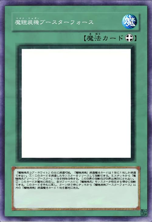 | 「魔鎧機兵コア・ホワイト」のみに装備可能。「魔鎧装機」装備魔法カードは1体に1枚しか装備できない。①:このカードを装備したモンスターをリリースして発動できる。EXデッキから「魔鎧機兵グリーン・ブースター」1体を特殊召喚する。この効果の発動及び効果は無効にされない。②:このカードが墓地に存在し、自分フィールドに「魔鎧機兵」モンスターが存在する場合に発動できる。このカードを手札に戻し、ターン終了時にデッキから「魔鎧装機ブースターフォース」以外の「魔鎧装機」装備魔法カード1枚を墓地に送る。 | |||