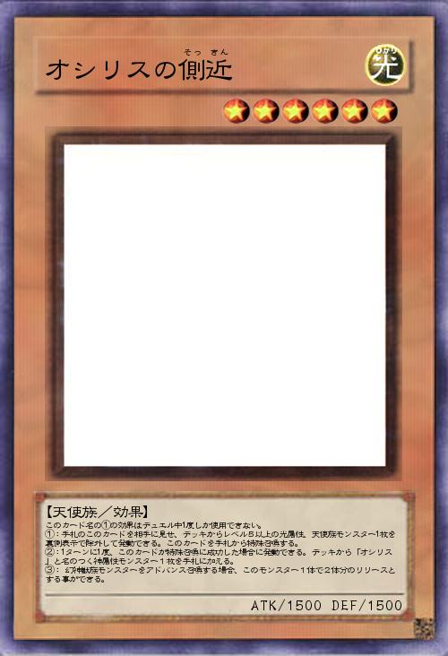 | このカード名の①の効果はデュエル中1度しか使用できない。 ①:手札のこのカードを相手に見せ、デッキからレベル5以上の光属性、天使族モンスター1枚を裏側表示で除外して発動できる。このカードを手札から特殊召喚する。 ②:1ターンに1度、このカードが特殊召喚に成功した場合に発動できる。デッキから「オシリス」と名のつく神属性モンスター1枚を手札に加える。 ③: 幻神獣族モンスターをアドバンス召喚する場合、このモンスター1体で2体分のリリースとする事ができる。 | |||