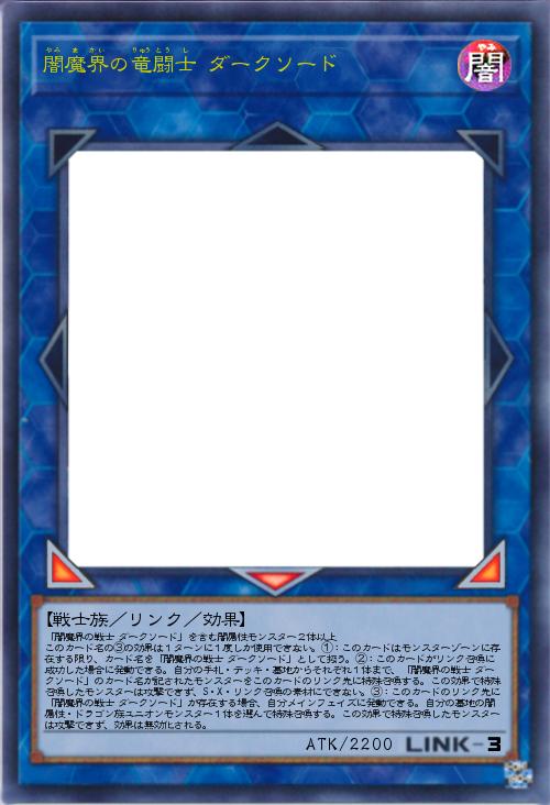 | 「闇魔界の戦士 ダークソード」を含む闇属性モンスター2体以上 このカード名の③の効果は1ターンに1度しか使用できない。①:このカードはモンスターゾーンに存在する限り、カード名を「闇魔界の戦士 ダークソード」として扱う。②:このカードがリンク召喚に成功した場合に発動できる。自分の手札・デッキ・墓地からそれぞれ1体まで、「闇魔界の戦士 ダークソード」のカード名が記されたモンスターをこのカードのリンク先に特殊召喚する。この効果で特殊召喚したモンスターは攻撃できず、S・X・リンク召喚の素材にできない。③:このカードのリンク先に「闇魔界の戦士 ダークソード」が存在する場合、自分メインフェイズに発動できる。自分の墓地の闇属性・ドラゴン族ユニオンモンスター1体を選んで特殊召喚する。この効果で特殊召喚したモンスターは攻撃できず、効果は無効化される。 | |||