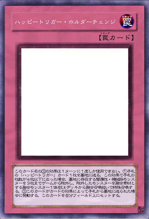 | このカード名の②の効果は1ターンに1度しか使用できない。①手札の「ハッピートリガー」カード1枚を墓地に送る。この効果で手札の枚数が4枚以下になった場合、墓地に存在する闇属性・機械族モンスターを3枚までゲームから除外し、除外したモンスターを融合素材とする融合モンスター1体をEXデッキから融合召喚扱いで特殊召喚する。②このカードがカードの効果によって手札から墓地に送られた場合に発動する。このカードを自分フィールド上にセットする。 | |||