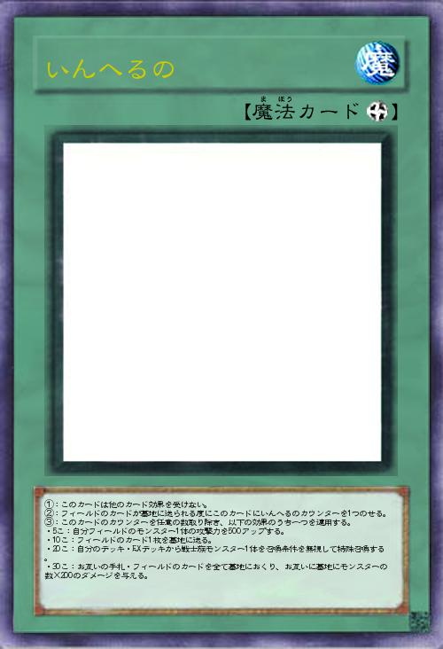 | ①:このカードは他のカード効果を受けない。 ②:フィールドのカードが墓地に送られる度にこのカードにいんへるのカウンターを1つのせる。 ③:このカードのカウンターを任意の数取り除き、以下の効果のうち一つを適用する。 ・5こ:自分フィールドのモンスター1体の攻撃力を500アップする。 ・10こ:フィールドのカード1枚を墓地に送る。 ・20こ:自分のデッキ・EXデッキから戦士族モンスター1体を召喚条件を無視して特殊召喚する。 ・30こ:お互いの手札・フィールドのカードを全て墓地におくり、お互いに墓地にモンスターの数×200のダメージを与える。 | |||