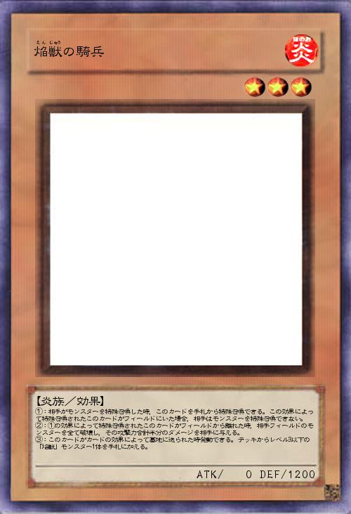 | ①:相手がモンスターを特殊召喚した時,このカードを手札から特殊召喚できる。この効果によって特殊召喚されたこのカードがフィールドにいた場合,相手はモンスターを特殊召喚できない。 ②:①の効果によって特殊召喚されたこのカードがフィールドから離れた時,相手フィールドのモンスターを全て破壊し,その攻撃力合計半分のダメージを相手に与える。 ③:このカードがカードの効果によって墓地に送られた時発動できる。デッキからレベル3以下の「焔獣」モンスター1体を手札に加える。 | |||