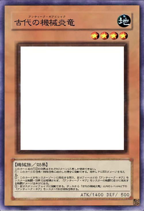 | このカード名の①③の効果はそれぞれ1ターンに1度しか使用できない。 ①:このカードの召喚・特殊召喚に成功した場合に発動できる。相手LPに500ダメージを与える。 ②:このカードがモンスターゾーンに存在する限り、自分フィールドの「アンティーク・ギア」モンスターは戦闘・効果では破壊されず、「アンティーク・ギア」モンスターの戦闘で自分に発生する戦闘ダメージは半分になる。 ③:自分スタンバイフェイズに発動できる。デッキから「古代の機械炎竜」以外のレベル4以下の「アンティーク・ギア」モンスター1体を特殊召喚する。 | |||