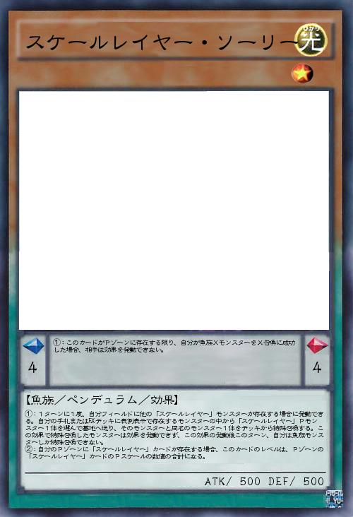 | ①:1ターンに1度、自分フィールドに他の「スケールレイヤー」モンスターが存在する場合に発動できる。自分の手札またはEXデッキに表側表示で存在するモンスターの中から「スケールレイヤー」Pモンスター1体を選んで墓地へ送り、そのモンスターと同名のモンスター1体をデッキから特殊召喚する。この効果で特殊召喚したモンスターは効果を発動できず、この効果の発動後このターン、自分は魚族モンスターしか特殊召喚できない。 ②:自分のPゾーンに「スケールレイヤー」カードが存在する場合、このカードのレベルは、Pゾーンの「スケールレイヤー」カードのPスケールの数値の合計になる。 | |||