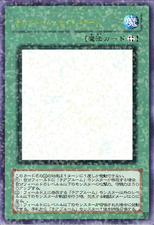 | このカード名の②の効果は1ターンに1度しか発動できない。 ①:自分フィールドに「チアブルーム」モンスターが存在する場合、自分フィールドのレベル4以下のモンスターの攻撃力、守備力は500アップする。 ②:フィールド上に存在する「チアブルーム」モンスター以外のレベル4以下のモンスターが戦闘を行う時、発生する戦闘ダメージは0になる。。 ③:フィールドにレベル4以下のモンスターが召喚された場合に発動できる。手札から「チアブルーム」モンスター1体を特殊召喚する。 | |||