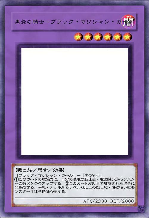 | 「ブラック・マジシャン・ガール」+「炎の剣士」 ①このカードの攻撃力は、自分の墓地の戦士族・魔法使い族モンスターの数×300アップする。②このカードが効果で破壊された場合に発動できる。手札・デッキからレベル6以上の戦士族・魔法使い族モンスター1体を特殊召喚する。 | |||