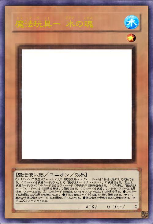 ①:1ターンに1度自分フィールド上の「魔法玩具ー ネクロ・ドール」1体を対象にして発動できる。このカードを装備カード扱いとして「魔法玩具ー ネクロ・ドール」に装備できる。または、装備カード扱いのこのカードを自分フィールドに守備表示で特殊召喚する。この効果は「魔法玩具ー ネクロ・ドール」の効果を無視して発動できる。このカードを装備しているモンスターは水属性モンスターとなる。②:このカードを装備しているモンスターは以下の効果を得る。●このカードは戦闘および効果で破壊されない。●手札の魔法カードを2枚墓地へ送り発動できる。デッキ、墓地から儀式魔法カードを1枚を選択し手札に加える。●儀式魔法が発動する度に発動する。相手に200ダメージを与える。」(2019-01-08 12:39)