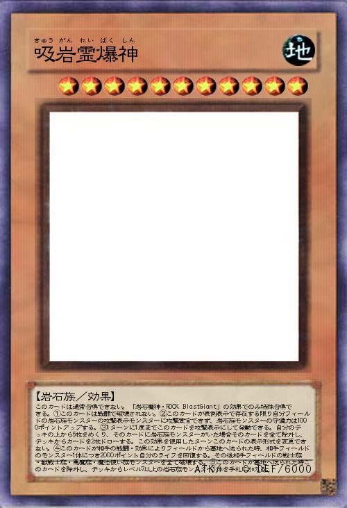 | このカードは通常召喚できない。「岩石魔神・ROCK BIastGiant」の効果でのみ特殊召喚できる。①このカードは戦闘で破壊されない。②このカードが表側表示で存在する限り自分フィールドの岩石族モンスターの攻撃表示モンスターに攻撃宣言できず、岩石族モンスターの守備力は1000ポイントアップする。③1ターンに1度までこのカードを攻撃表示にして発動できる。自分のデッキの上から5枚をめくり、そのカードに岩石族モンスターがいた場合そのカードを全て除外し、デッキからカードを2枚ドローする。この効果を使用したターンこのカードの表示形式を変更できない。④このカードが相手の戦闘・効果によりフィールドから墓地へ送られた時、相手フィールドのモンスター1体につき2000ポイント自分のライフを回復する。その後相手フィールドの戦士族・獣戦士族・悪魔族・魔法使い族モンスターを全て破壊する。⑤このカードが墓地へ送られた | |||