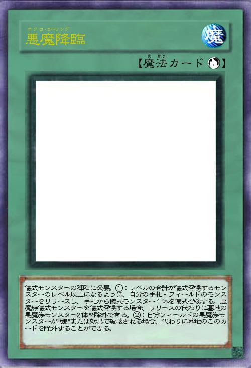 | 儀式モンスターの降臨に必要。①:レベルの合計が儀式召喚するモンスターのレベル以上になるように、自分の手札・フィールドのモンスターをリリースし、手札から儀式モンスター1体を儀式召喚する。悪魔族儀式モンスターを儀式召喚する場合、リリースの代わりに墓地の悪魔族モンスター2体を除外できる。②:自分フィールドの悪魔族モンスターが戦闘または効果で破壊される場合、代わりに墓地のこのカードを除外することができる。 | |||
