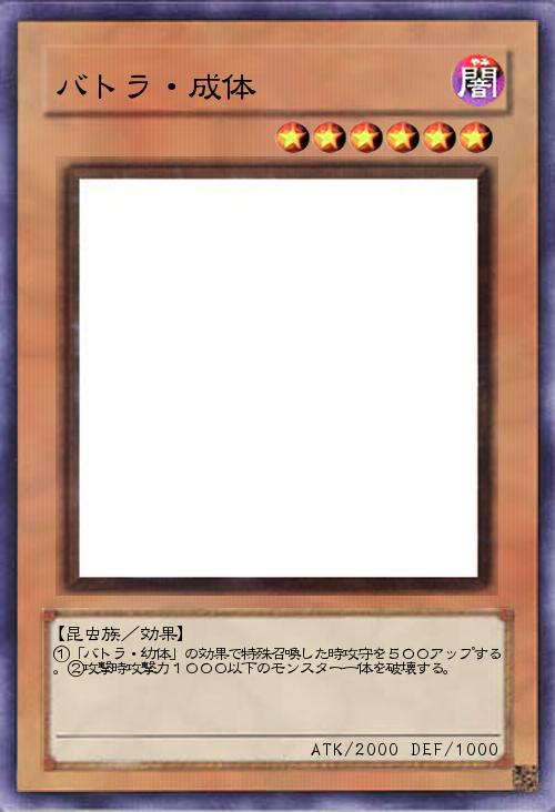 「①「バトラ・成体」の効果で特殊召喚した時攻守を500アップする。②攻撃時攻撃力1000以下のモンスター一体を破壊する。」(2018-12-05 18:00)