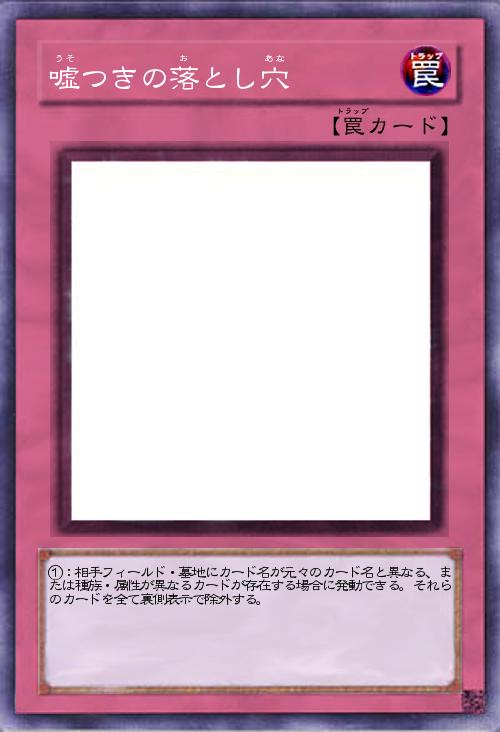 | ①:相手フィールド・墓地にカード名が元々のカード名と異なる、または種族・属性が異なるカードが存在する場合に発動できる。それらのカードを全て裏側表示で除外する。 | |||
