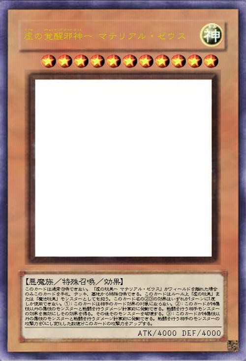 | このカードは通常召喚できない。「虚の玩具ー マテリアル・ゼウス」がフィールドを離れた場合のみこのカードを手札、デッキ、墓地から特殊召喚できる。このカードはルール上「虚の玩具」または「魔法玩具」モンスターとしても扱う。このカード名の②③の効果はいずれか1ターンに1度しか使用できない。①:このカードは相手のカード効果の対象にならない。②:このカードが神属性以外の属性のモンスターと戦闘を行うダメージ計算前に発動できる。戦闘を行う相手モンスターの効果を無効にしその効果を得る。その後そのモンスターを破壊する。③:このカードが神属性以外の属性のモンスターと戦闘を行うダメージ計算前に発動できる。戦闘を行う相手のモンスターの攻撃力を0にし変化した数値分このカードの攻撃力をアップする。 | |||