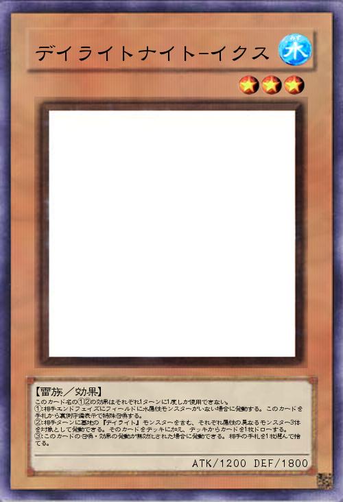 | このカード名の①②の効果はそれぞれ1ターンに1度しか使用できない。 ①:相手エンドフェイズにフィールドに水属性モンスターがいない場合に発動する。このカードを手札から裏側守備表示で特殊召喚する。 ②:相手ターンに墓地の『デイライト』モンスターを含む、それぞれ属性の異なるモンスター3体を対象として発動できる。そのカードをデッキに加え、デッキからカードを1枚ドローする。 ③:このカードの召喚・効果の発動が無効化された場合に発動できる。相手の手札を1枚選んで捨てる。 | |||