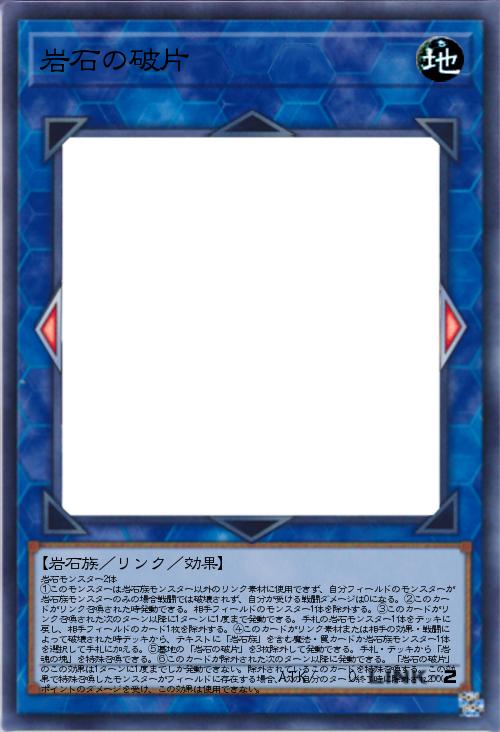 | 岩石モンスター2体 ①このモンスターは岩石族モンスター以外のリンク素材に使用できず、自分フィールドのモンスターが岩石族モンスターのみの場合戦闘では破壊されず、自分が受ける戦闘ダメージは0になる。②このカードがリンク召喚された時発動できる。相手フィールドのモンスター1体を除外する。③このカードがリンク召喚された次のターン以降に1ターンに1度まで発動できる。手札の岩石モンスター1体をデッキに戻し、相手フィールドのカード1枚を除外する。④このカードがリンク素材または相手の効果・戦闘によって破壊された時デッキから、テキストに「岩石族」を含む魔法・罠カードか岩石族モンスター1体を選択して手札に加える。⑤墓地の「岩石の破片」を3枚除外して発動できる。手札・デッキから「岩魂の塊」を特殊召喚できる。⑥このカードが除外された次のターン以降に発動できる。「岩石の破片」のこの効果は1ターンに1度までしか発動でき | |||