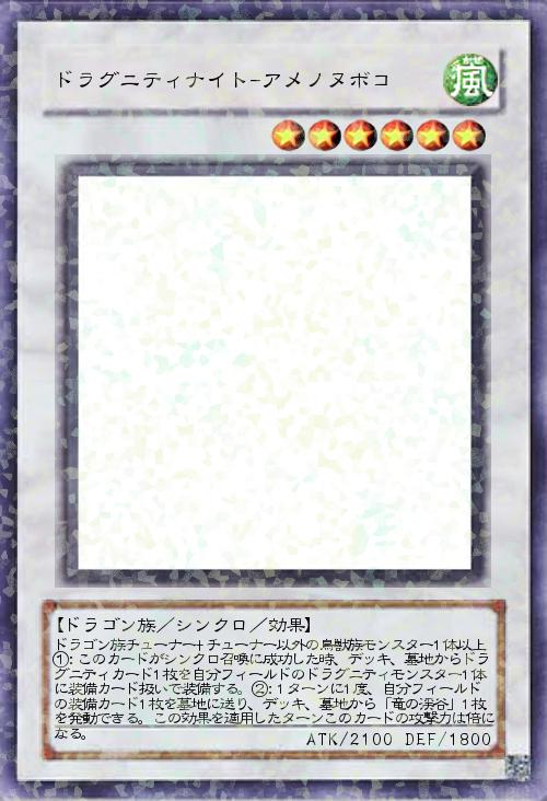 「新ドラグニティシンクロモンスター。モチーフは日本神話の武器天沼矛。竜の渓谷をデッキ、墓地から発動できるのはこの槍の持ち主であり日本の創造神であるイザナギを元にしている。」(2018-12-12 03:04)